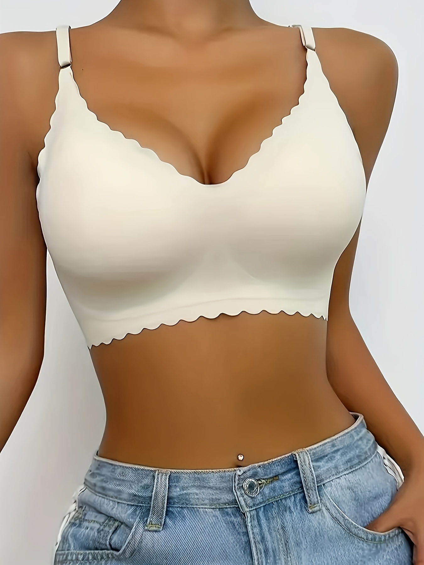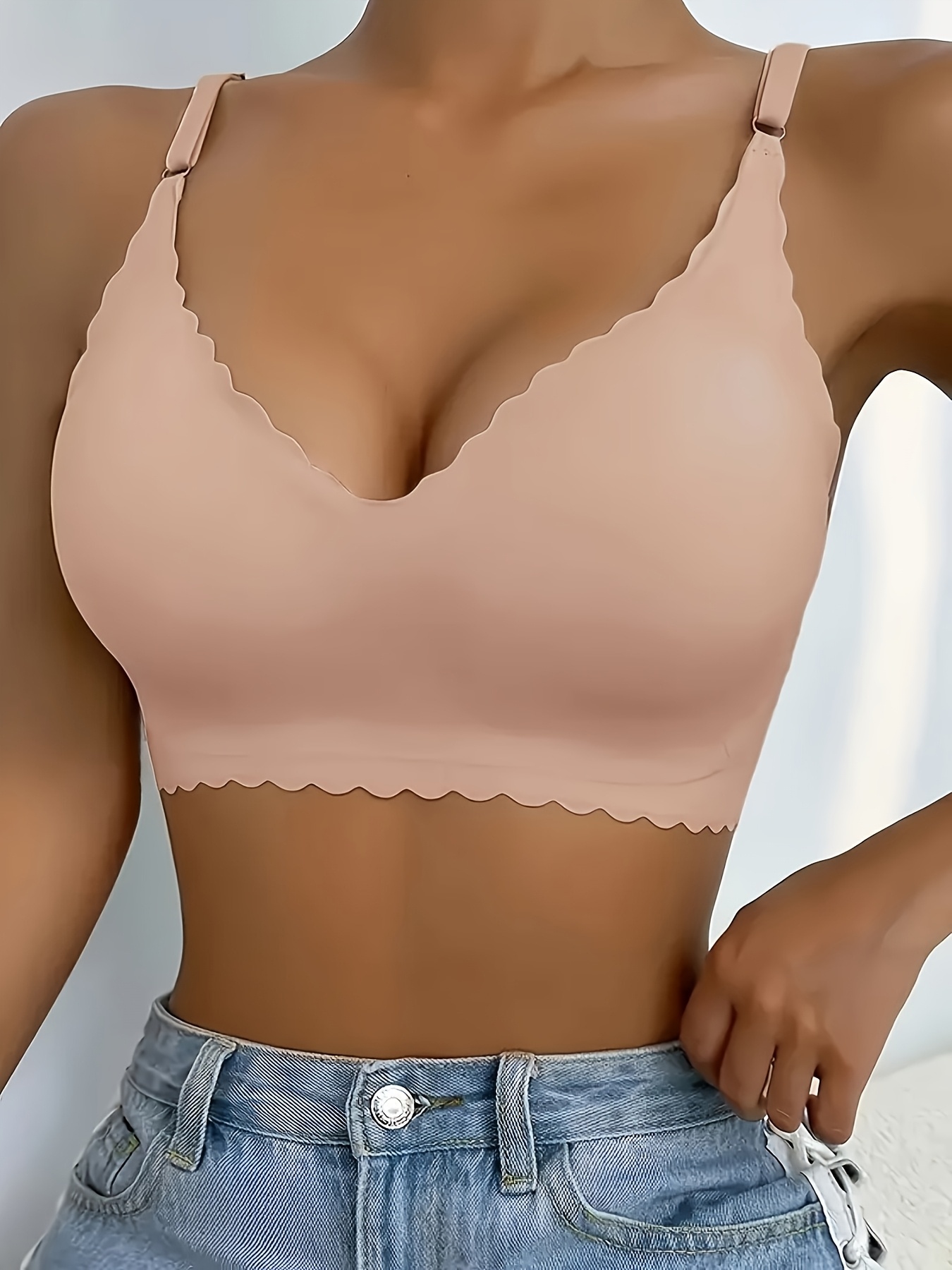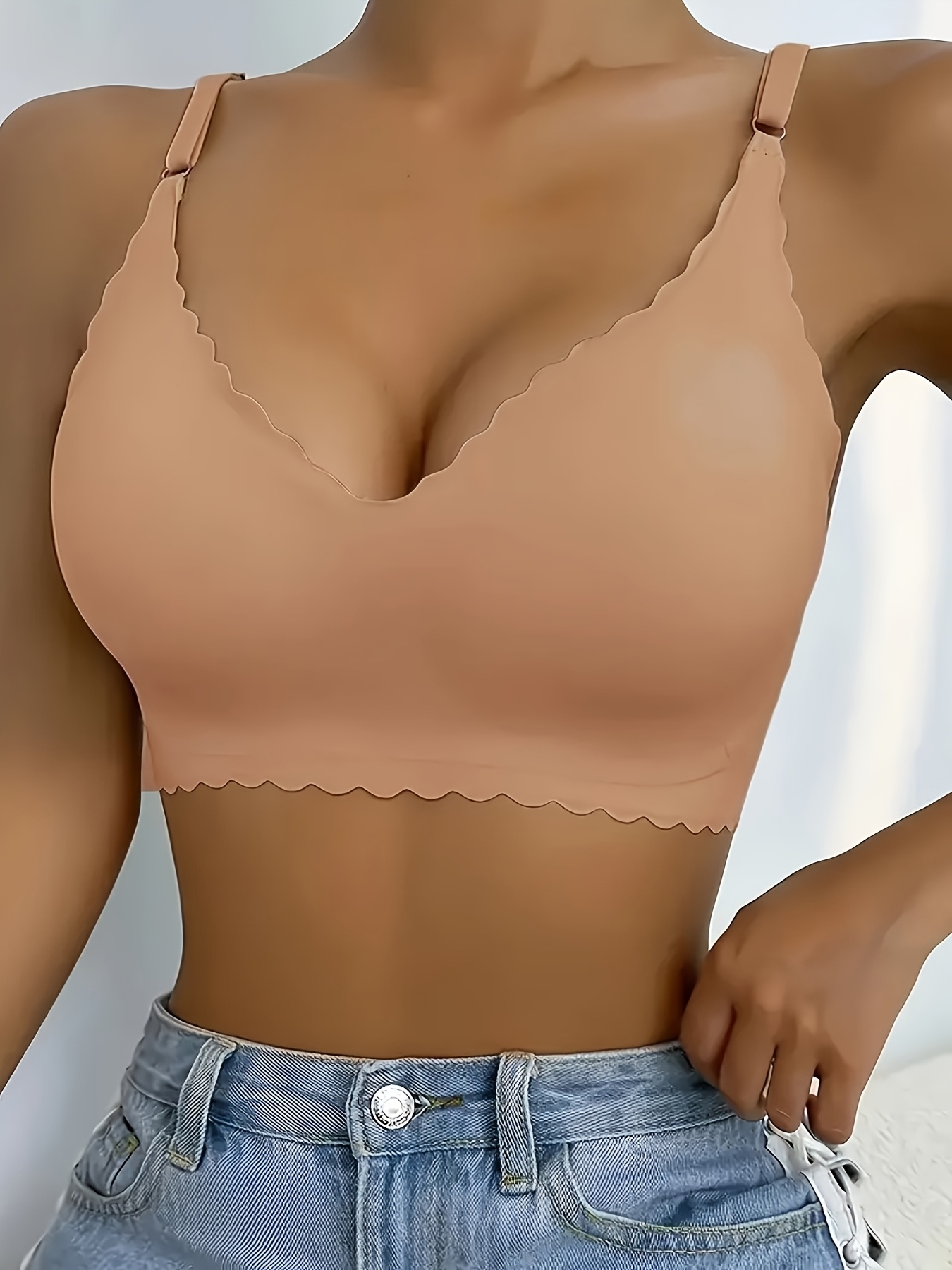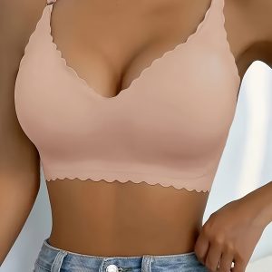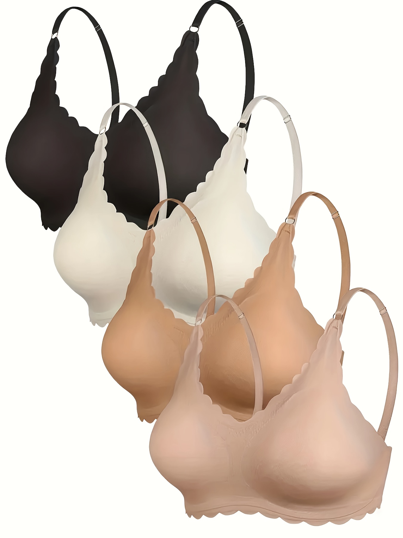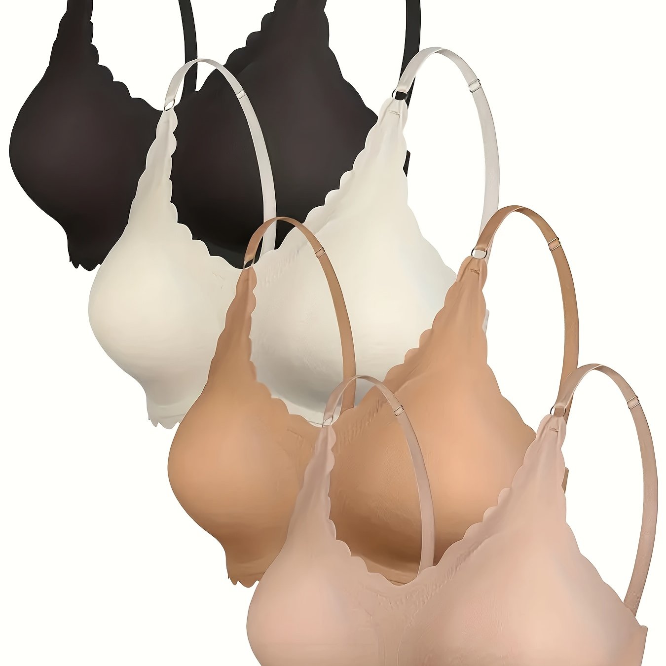 4pcs Women’s Plus Size Wire-Free s Bras with Adjustable Straps, High Elasticity & Removable Pads – Minimalist Wave Edge Design, 95% Nylonu002F5% Elastane for, Workouts (Blacku002FWhiteu002FBeigeu002FLight Brown)