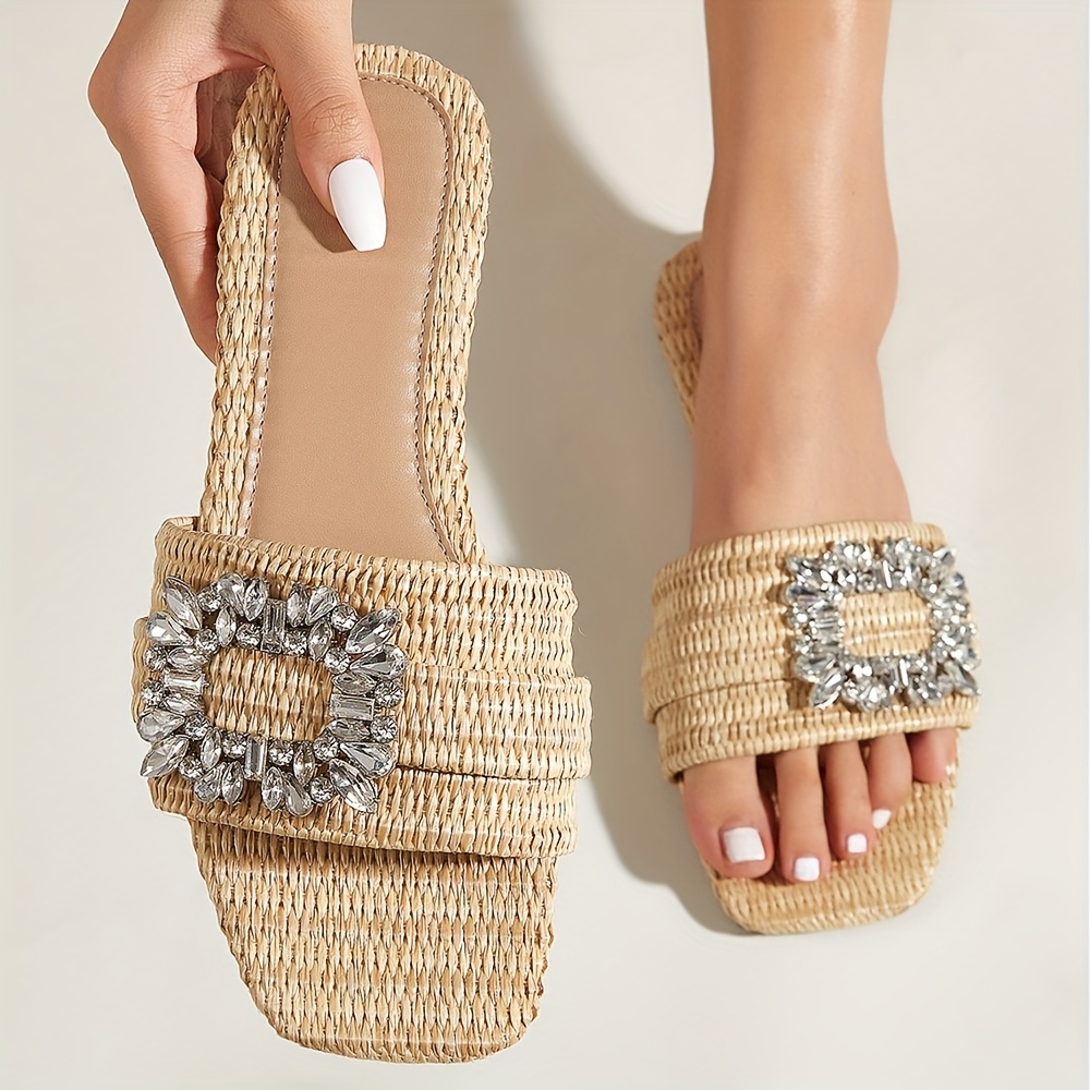 - Women Espadrille Slids Rhinestones Straw Woven Flats Sandals Square Open Toe Slip On Casual Beach Comfy Shoes