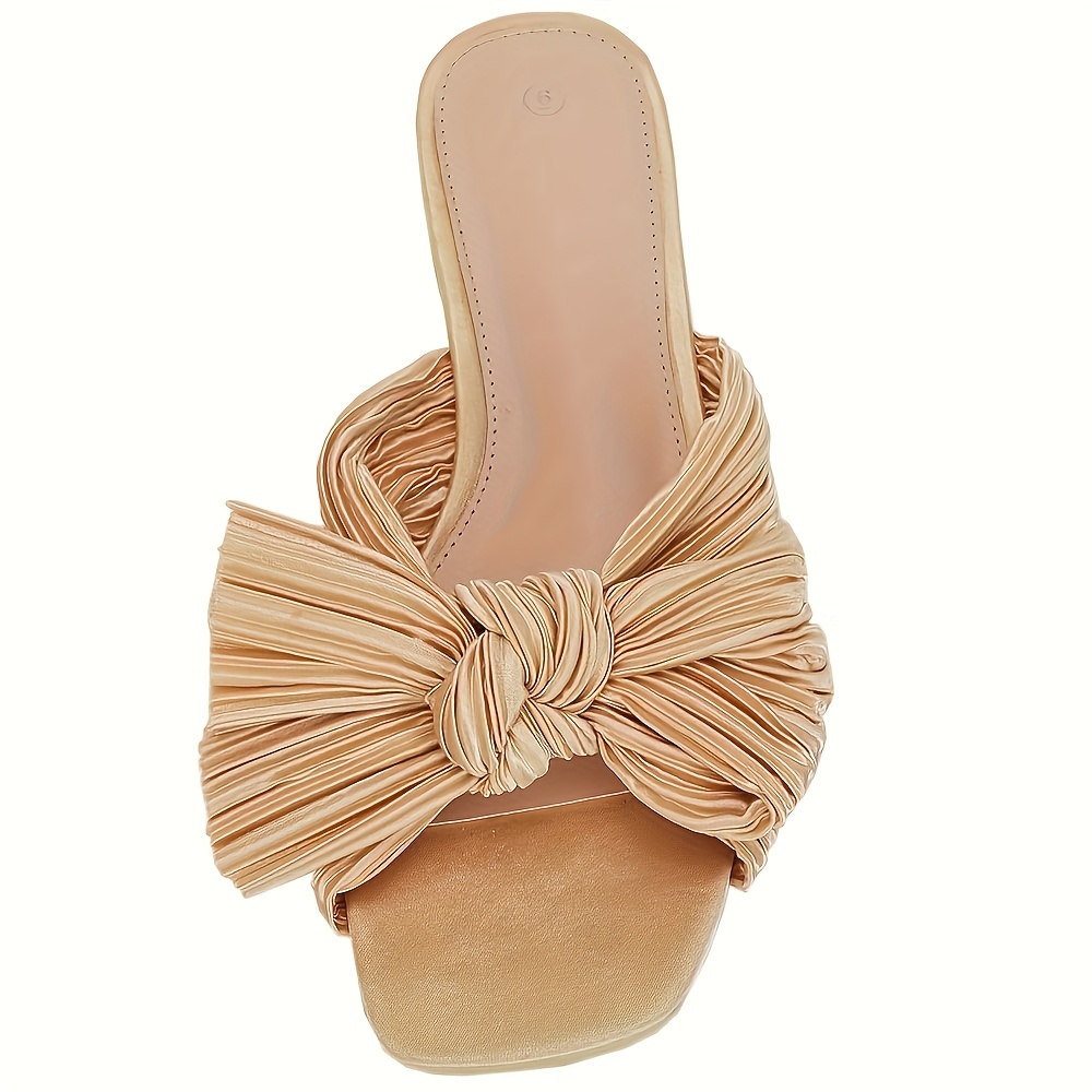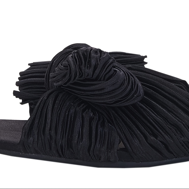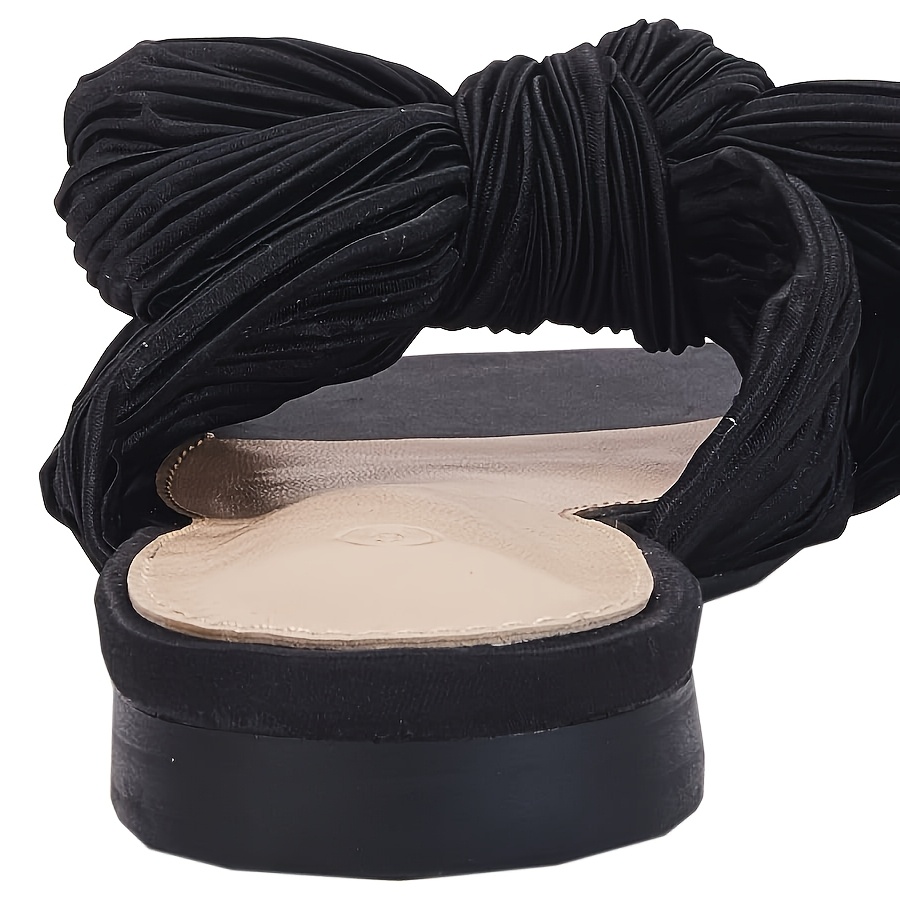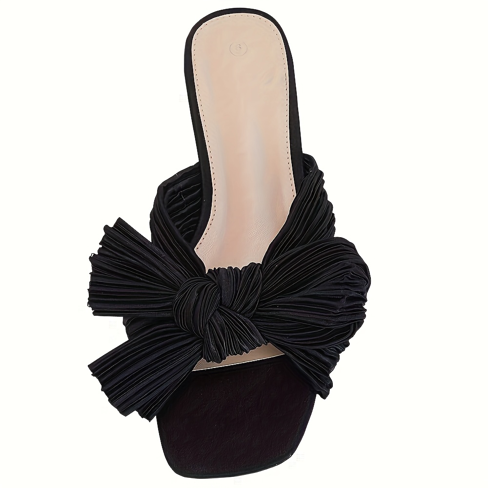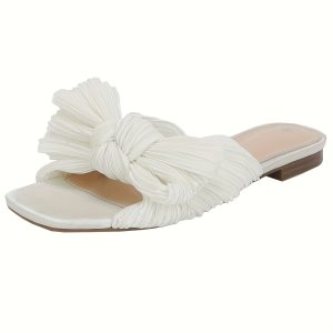 - Women’s Pleated Bow Flat Slide Sandals – Open Square Toe Slip-On Summer Shoes with Breathable Fabric Upper & Soft Synthetic Cover Insole, Machine Washable Casual Comfort Footwear, Elegant Shoe Design